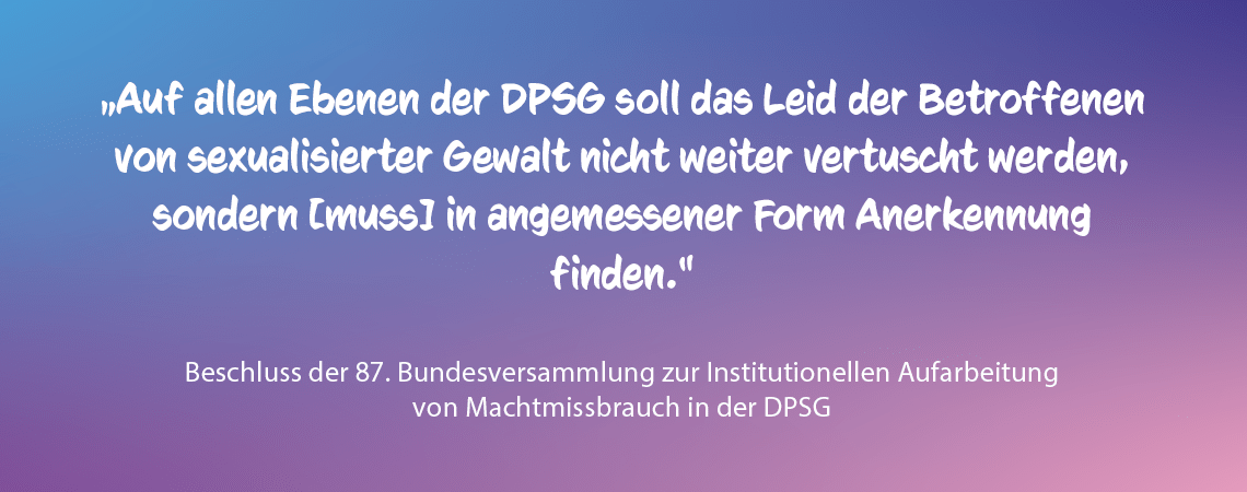 Die DPSG ist sich ihres institutionellen Versagens bewusst und übernimmt Verantwortung für das Leid, das Betroffene innerhalb des Verbandes erfahren mussten und müssen. DPSG-Bundesvorsitzende Annkathrin Meyer richtet ihre Worte gezielt an die vielen Betroffenen: „Wir erkennen Euer Leid an. Auch erkennen wir das Leid der vielen Betroffenen an, die sich durch das Versagen von Systemen und Strukturen in der DPSG bisher noch nicht bemerkbar machen konnten oder wollten.“ Auch zukünftig sollen die Betroffenen im Fokus des Aufarbeitungsprozesses stehen, sagt Annika Daiker, Sprecherin des Aufarbeitungsbeirates: „Wir werden alles daransetzen, dass die Betroffenen niemals aus dem Blick verloren gehen.“